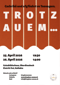 Wir sind 6 Jugendliche aus Oberdiessbach die versuchen ein Theater auf die Beine zu stellen. Nun ist es soweit, am 25. & 26. April 2026 werden wir unser Theater aufführen im Geissbühlerhaus von Oberdiessbach. Unser Theater ist allerdings schon seit langem nicht mehr ein Projekt unter Jugendlichen, es ist ein Gemeinschaftsprojekt unserer Gemeinde.